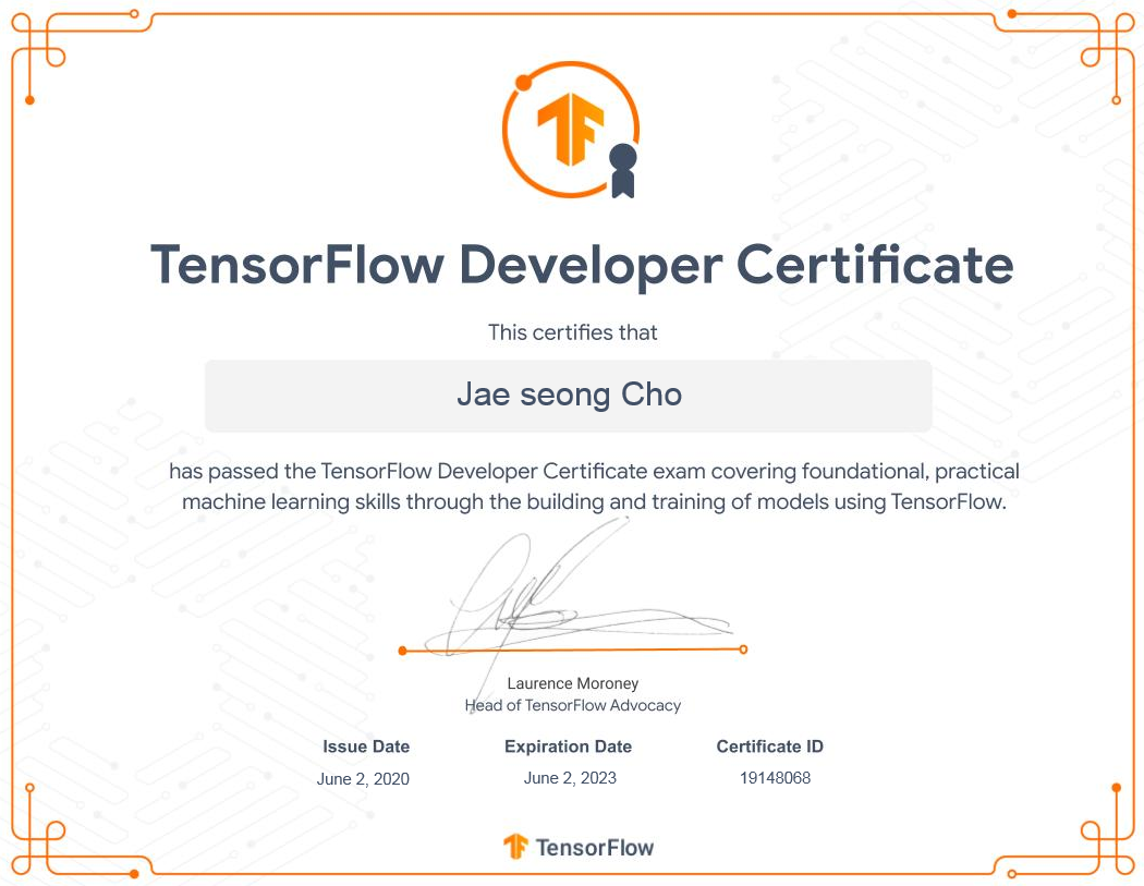 머신러닝 및 딥러닝 기본 원칙, 모델 개발하기, 심층신경망 및 합성곱 신경망(CNN)을 통한 이미지 인식,객체 탐지,텍스트 인식 알고리즘 빌드, 컴퓨터가 정보를 '보는' 방식과 플롯 손실 및 정확도 이해할 수 있도록 다른 크기 및 형태의 실제 이미지를 활용하여 합성곱에서 이미지의 경로를 시각화, 과적합을 예방하기 위한 확장 및 드롭아웃과 같은 전략 탐색, TensorFlow를 이용하여 자연어 처리 문제를 해결하기 위해 신경망 적용 등의 능력을 평가하여 통과한 자격증입니다.